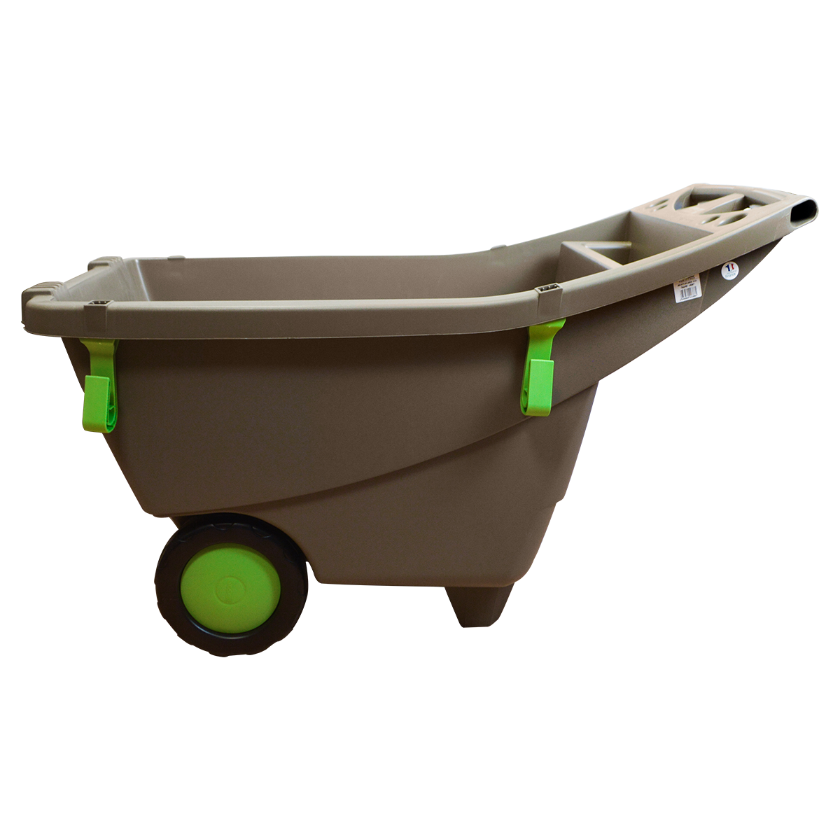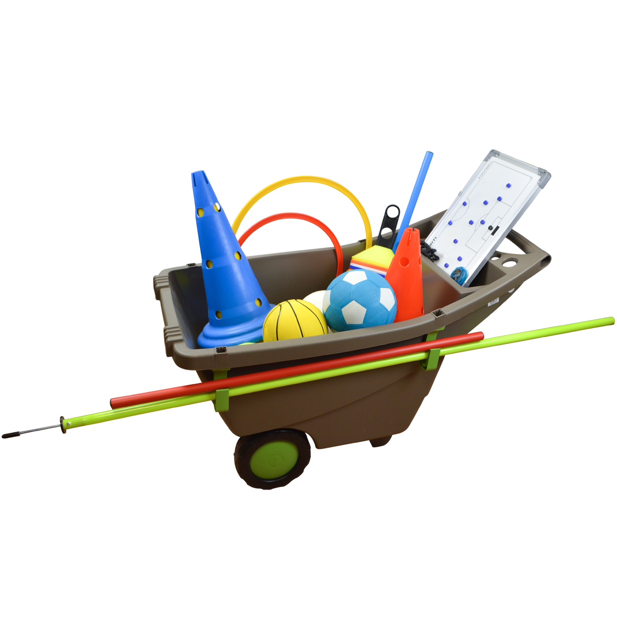 Brouette de Transport. Brouette de transport en polypropylène de couleur taupe / vert matcha. Avec sa capacité de 140L, elle vous permet d’éviter les aller-retours lors du transport de votre matériel d’entraînement. Légère et très maniable grâce à ses 2 roues permettant un transport sur herbe ou en salle. + Produit : stockage vertical pour un gain de place, grandes roues pour un transport aisé, même sur terrain en herbe.