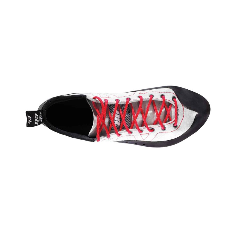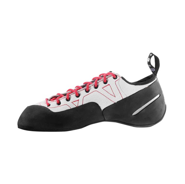 Le chausson Torch avec lacets de chez EB Escalade possède un confort exceptionnel pour les grimpeurs confirmés. Avec sa forme peu asymétrique et peu cambrée, le confort y est maximum. La tige intégralement en micro fibre élastique s’adapte parfaitement à la forme de votre pied. Enfin le serrage avec un double velcro procure un bon maintien du pied dans le chausson d’escalade. Idéal en AS Escalade et Universités. La déclinaison lacet du chausson d’escalade Torch. Comme la version velcro mais avec un serrage plus précis et ajustable, le Torch Lace assure une progression rapide du grimpeur loisir. Un très bon modèle pour l’escalade en salle comme sur le rocher. Peu symétrique et peu cambré, le Torch lacet s’adresse, comme le Torch velcro, aux grimpeurs cherchant à progresser avec un chausson confortable. Le système de laçage qui descend très bas sur la pointe offre plusieurs avantages. Le Torch Lacet s’adapte à toutes les morphologies de pieds. Le grimpeur peut ajuster le serrage en fonction de la typologie de la voie pour orienter le chausson vers le confort ou la précision ; à lui de placer le curseur suivant ses besoins. La gomme Optima assure une bonne durabilité du chausson et une adhérence optimale.