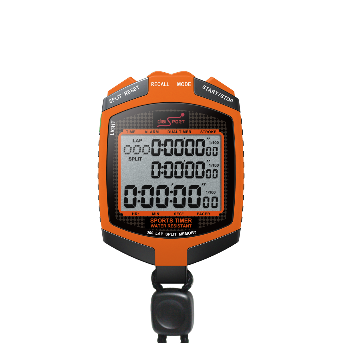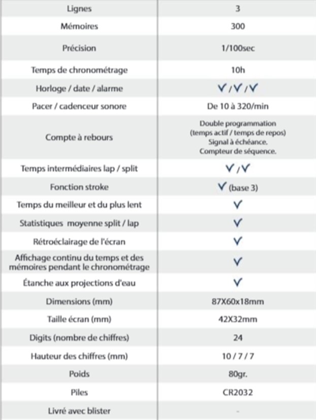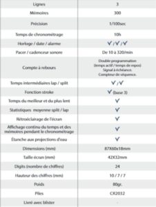 Chronomètre 300 Mémoires de marque Digi Sport. 3 lignes 300 mémoires au 1/100 de seconde avec écran rétro-éclairé – Compteur de tours – Double compte à rebours programmable avec signal en fin de décompte – Affichage meilleur temps / moins bon temps / calcul temps moyen – Programmation temps fractionnés (pacer – cadenceur) de 10 à 320 – Fonction Stroke – Affichage du mois, date, année et fonction alarme programmable – Format 12/24 – Etanche à l’eau 3 ATM et ne coule pas – Utilise 1 pile type CR2032 lithium – Avec pacer / cadenceur sonore de 10 à 20/min – Dimensions : 87 x 60 x 18mm – Taille écran 42 x 32 mm – 24 chiffres – Hauteur des chiffres : 10 / 7 / 7 mm – Poids : 80g. L’unité.