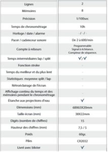 Chronomètre 8 Mémoires de marque Digi Sport. Mémorisation de 8 temps intermédiaires + cumul temps total – Moniteur de cadence sonore (2 à 600bips / minutes) – Compte à rebours + chronométrage jusqu’ à 10h – Compte à rebours jusqu’ à 99 fractions du parcours – Étanche aux projections d’eau – Pile CR2032 – Dimensions […]