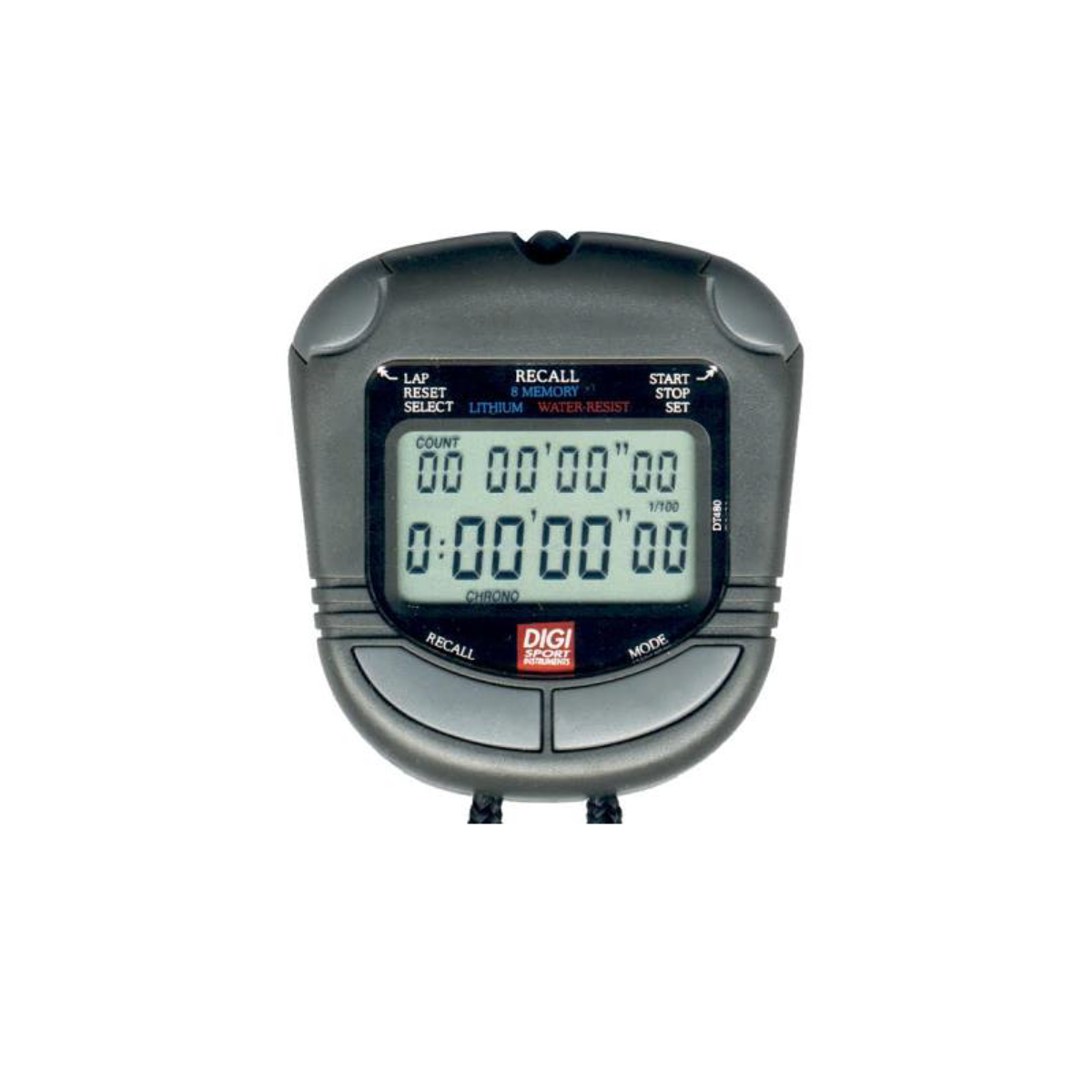 Chronomètre 8 Mémoires de marque Digi Sport. Mémorisation de 8 temps intermédiaires + cumul temps total – Moniteur de cadence sonore (2 à 600bips / minutes) – Compte à rebours + chronométrage jusqu’ à 10h – Compte à rebours jusqu’ à 99 fractions du parcours – Étanche aux projections d’eau – Pile CR2032 – Dimensions : 68 x 63 x 20mm – Taille de l’écran 38 x 22mm – 15 chiffres – Hauteur des chiffres 7,5 / 5mm – Poids : 60 g – Livré avec blister. L’unité.