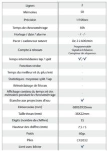 Chronomètre 50 Mémoires de marque Digi Sport. Chronomètre 2 lignes – Mémorisation de 50 temps intermédiaires + cumul temps total – Moniteur de cadence sonore (2 à 600bips / minutes) – Compte à rebours + chronométrage jusqu’ à 10h – Compte à rebours jusqu’ à 99 fractions du parcours – Étanche aux projections d’eau – […]