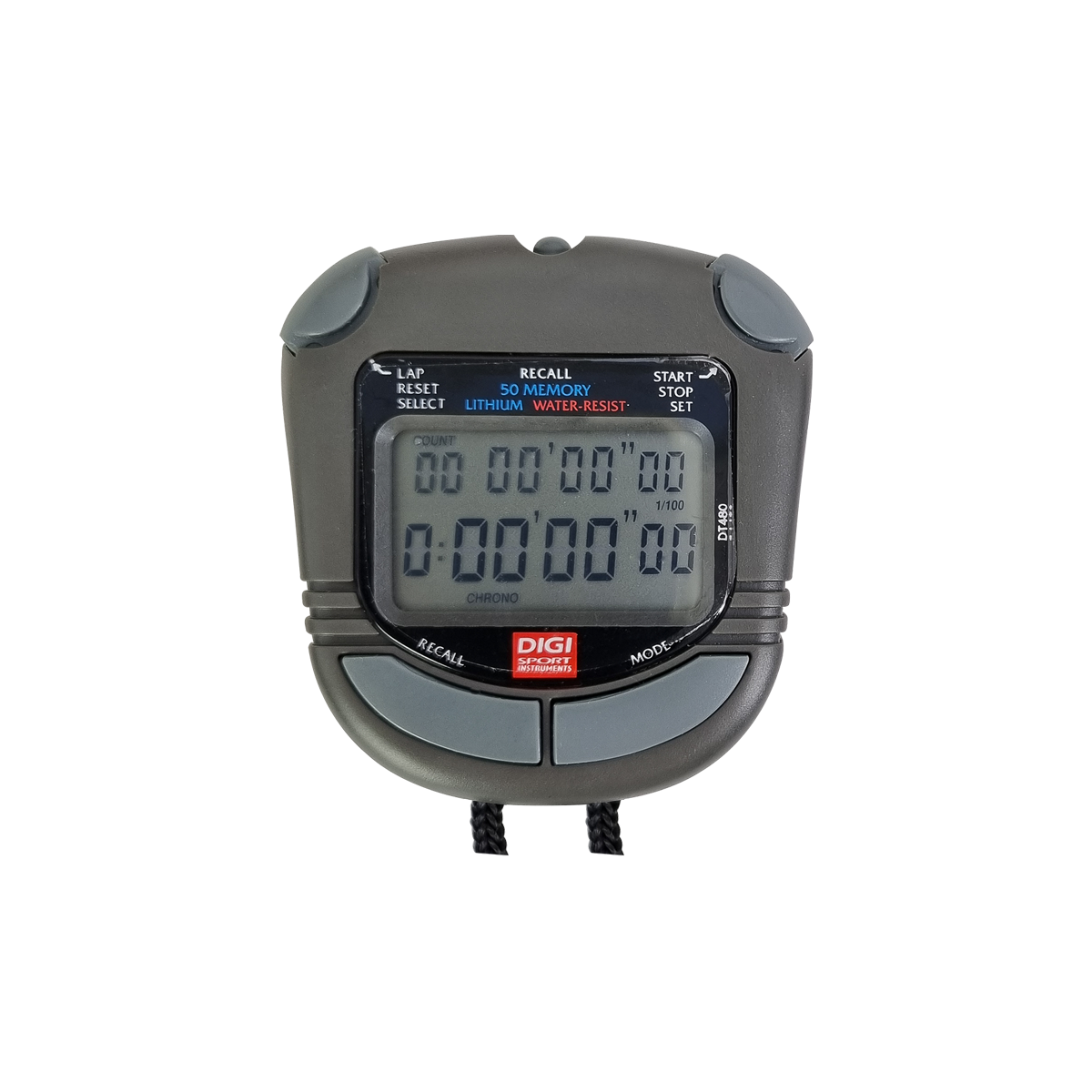 Chronomètre 50 Mémoires de marque Digi Sport. Chronomètre 2 lignes – Mémorisation de 50 temps intermédiaires + cumul temps total – Moniteur de cadence sonore (2 à 600bips / minutes) – Compte à rebours + chronométrage jusqu’ à 10h – Compte à rebours jusqu’ à 99 fractions du parcours – Étanche aux projections d’eau – Pile CR2032 – Dimensions : 68 x 63 x 20mm – Taille de l’écran 38 x 22mm – 15 chiffres – Hauteur des chiffres 7,5 / 5mm – Poids : 60 g – Livré avec blister. L’unité.
