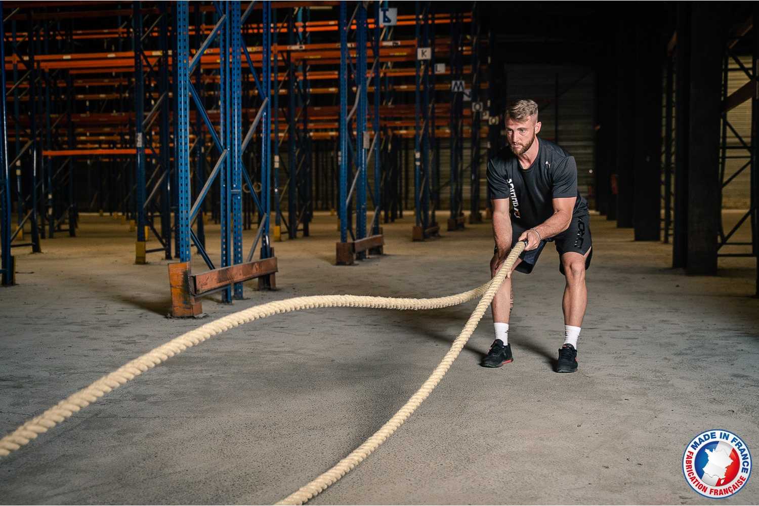 L’avantage des cordes classic rope est leur réalisation en polypropylène, une matière qui leur permet d’être sans odeur et de résister à l’humidité et à l’eau contrairement au chanvre. Elles se déclinent en 3 longueurs: 9 m, 12 m et 15 m (voir menu déroulant ci-dessous). Les cordes de 12 m et de 15 m sont destinées au pratiquant débutant à expérimenté. Celles de 9 m sont plutôt réservées aux enfants ou aux adolescents. Matières premières 100% françaises et confection de la Battle Classic Rope réalisée en France. Nature : polypropylène texturé, ne craignant ni l’eau ni l’humidité. Sans odeur. Diamètre : 38 mm. Munies de poignées à chaque extrémité. Produit résistant aux UV. Couleur : ocre, type chanvre. Utilisation en intérieur comme en extérieur. Utilisez un point d’ancrage pour passer la corde. Il soit être solide et suffisamment arrondi afin de ne pas sectionner le cordage après quelques utilisations (voir fixation pour corde ondulatoire Ref: CROSSFIT110LAD).