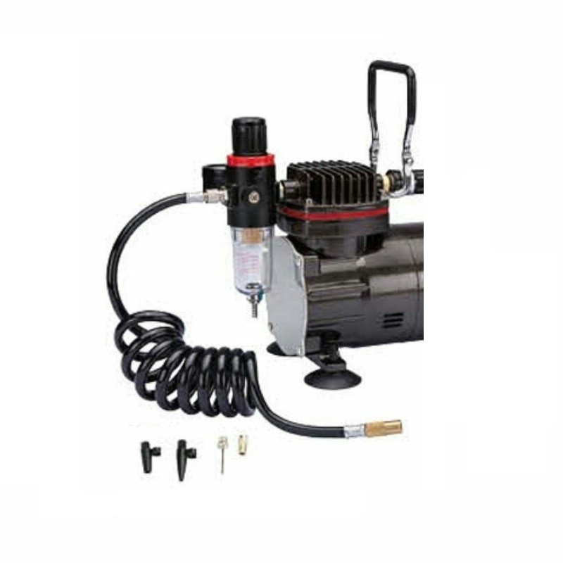 Compresseur électrique avec manomètre intégré, interrupteur marche/arrêt.