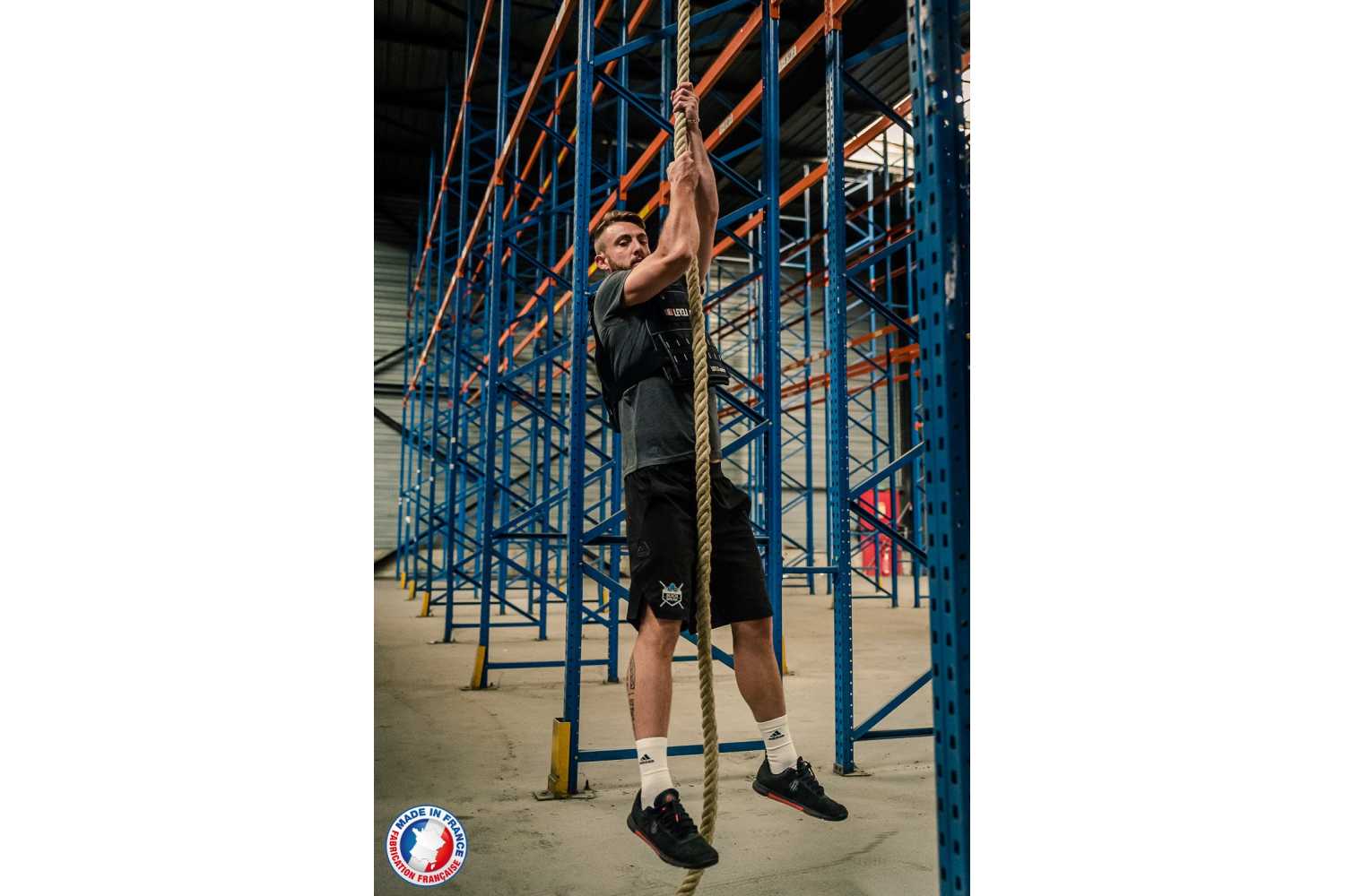 Corde à grimper de gros diamètre. Avec son diamètre de 40 mm, elle va vous éprouver les avant-bras. Disponible en plusieurs longueurs : 2 m – 3 m – 4 m – 5 m – 6 m – 8 m et 10 m (voir menu déroulant ci-dessous). Son avantage est qu’elle sollicite en même temps les bras, les épaules, le grip, la coordination et l’endurance. La corde LEVEL addict a une structure en polypropylène, est sans odeur et permet un usage aussi bien en intérieur qu’en extérieur. Matières premières de la Corde à Grimper et confection 100% françaises. Nature : polypropylène texturé, ne craignant ni l’eau ni l’humidité. Sans odeur. Diamètre : 40 mm. Munie d’une fixation constituée d’un mousqueton à vis à son extrémité. Produit résistant aux UV. Couleur : ocre, type chanvre. Utilisation en intérieur comme en extérieur. Utilisez un point d’ancrage solide pour fixer la corde, soit en passant le bout libre dans l’épissure si le support est de gros diamètre, soit un utilisant la fixation adaptée composée d’une sangle et d’un maillon rapide (fournie dans la partie accessoires) pour un support en forme d’anneau. Il est essentiel de se protéger en ajoutant des tapis amortisseur de chute en dessous de la corde et de vérifier régulièrement les points d’ancrage. Par sécurité, une zone suffisante au sol autour de la corde doit être dégagée de tout objet. Toute usure visible doit entraîner le retrait immédiat de la corde.
