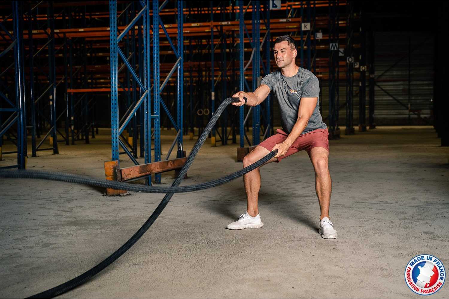 Les Battle élite Rope se déclinent en 12 m et en 15 m. Matières premières 100% françaises et confection de la Battle Elite Rope réalisée en France. Nature : polyester tressé, matériau très résistant. Diamètre : 38 mm. Poids : 11 kg en 12 m et 13,8 kg en 15 m. Munies de poignées à chaque extrémité. Produit résistant aux UV. Couleur : noire. Utilisation en intérieur comme en extérieur. Utilisez un point d’ancrage pour passer la corde. Il soit être solide et suffisamment arrondi afin de ne pas sectionner le cordage après quelques utilisations (voir fixation pour corde ondulatoire Ref: CROSSFIT110LAD).