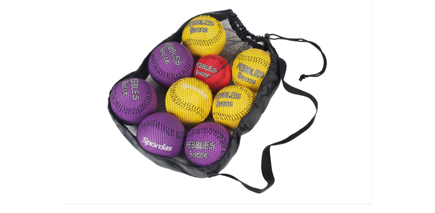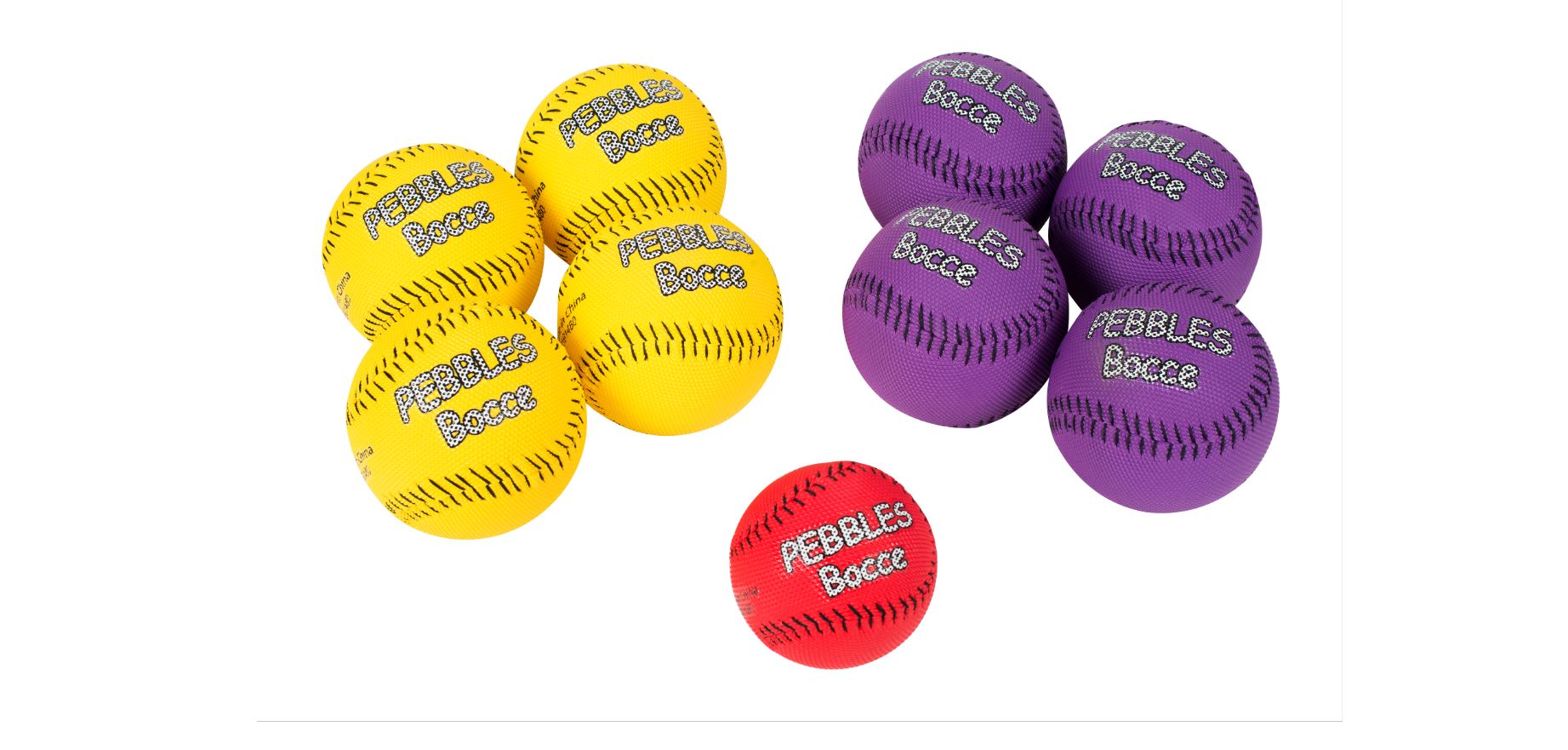 Le kit comprend : 4 balles violettes et 4 balles jaunes (diamètre 10cm) ainsi qu’ 1 cochonnet rouge de 7,5cm de diamètre et 1 sac de rangement.