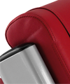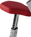 Caractéristiques du confort : roulettes de transport, sièges et appuis moulés par injection, sellerie antibactérienne. Poignée jaune visible pour le réglage du banc. Châssis gris. Sellerie rouge.