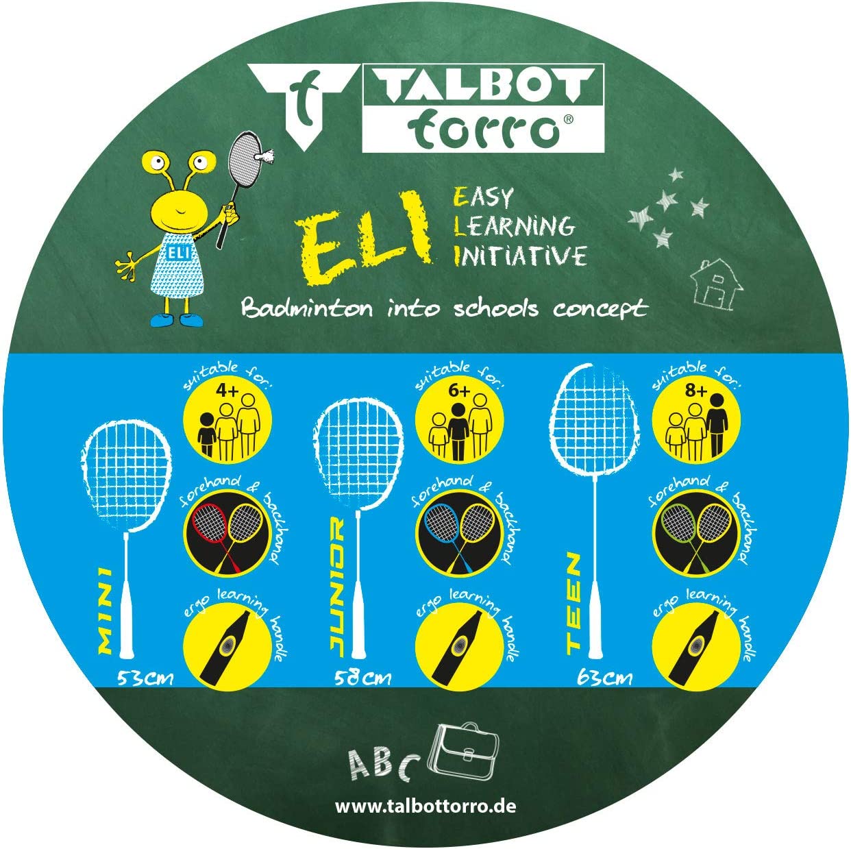 Raquette de badminton ELI Teen 63cm pour les 8-10 ans de marque Talbot Torro. L’ELI Teen est la raquette de la série ELI de Talbot-Torro pour les 8 à 10 ans. Elle a une tête isométrique avec un sweet spot agrandi pour un jeu indulgent (sur les coups décentrés). Grâce au manche raccourci, la raquette (seulement 63 cm) est facile à manier pour les juniors, plus légère et le contact avec le sol est évité. La poignée spéciale d’apprentissage est ovale et est donc inconfortable dans la main lorsque le manche est mal tenu (position dite de la poêle à frire). De plus, toutes les raquettes ELI sont équipées d’un concept innovant de bande antidérapante qui montre à l’élève la position correcte des doigts pour le coup droit et le revers à l’aide de marquages colorés (autocontrôle). Disponible toute l’année dans notre stock ESAT.