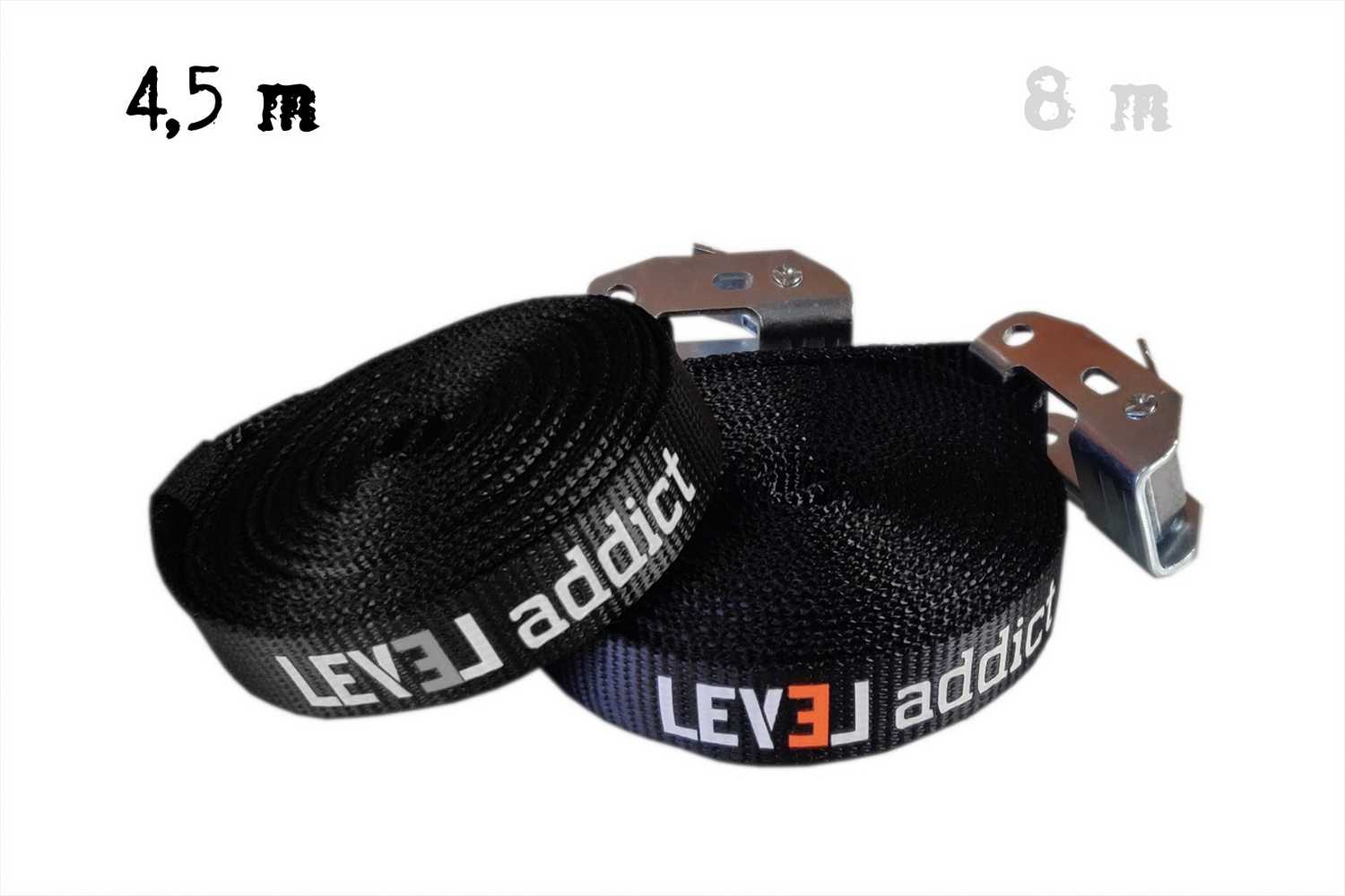 Longueur du modèle : 4.5 m (longueur standard) ou 8.00 m (grande longueur): voir menu déroulant ci-dessous. Sangle de haute résistance de fabrication française, testées à plus de 2 000 kg, en polyester de couleur noire vous permettant d’accrocher vos anneaux sur tout support adapté. Boucle à came très résistante avec un ressort puissant permettant de caler précisément les sangles à la hauteur souhaitée. Elles sont signées de la marque LEVEL addict. Matériaux 100% français et confection des sangles réalisée en France. Matière première en polyester, testées à plus de 2000 kg. Poids : 650 gr en 4.5 m et 800 gr en 8 m. Couleur : noire. Largeur de la sangle : 25 mm. Existe en deux longueurs : 4.5 m et 8 m. Vendue à l’unité. Utilisation en intérieur comme en extérieur sauf en cas de pluie. Stockage dans un lieu abrité et sec. Lors de l’installation, toujours procéder à un test de maintien des sangles avant de se lancer dans les mouvements aériens. L’utilisation du matériel sur des supports non adaptés peut entraîner une détérioration de la sangle. Il faut donc procéder à des vérifications périodiques de leur état et procéder à leur changement impératif si l’une d’elles venait à présenter une anomalie.