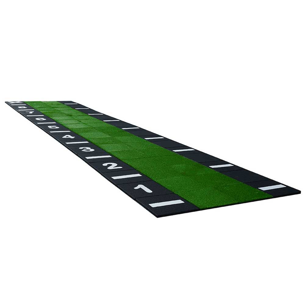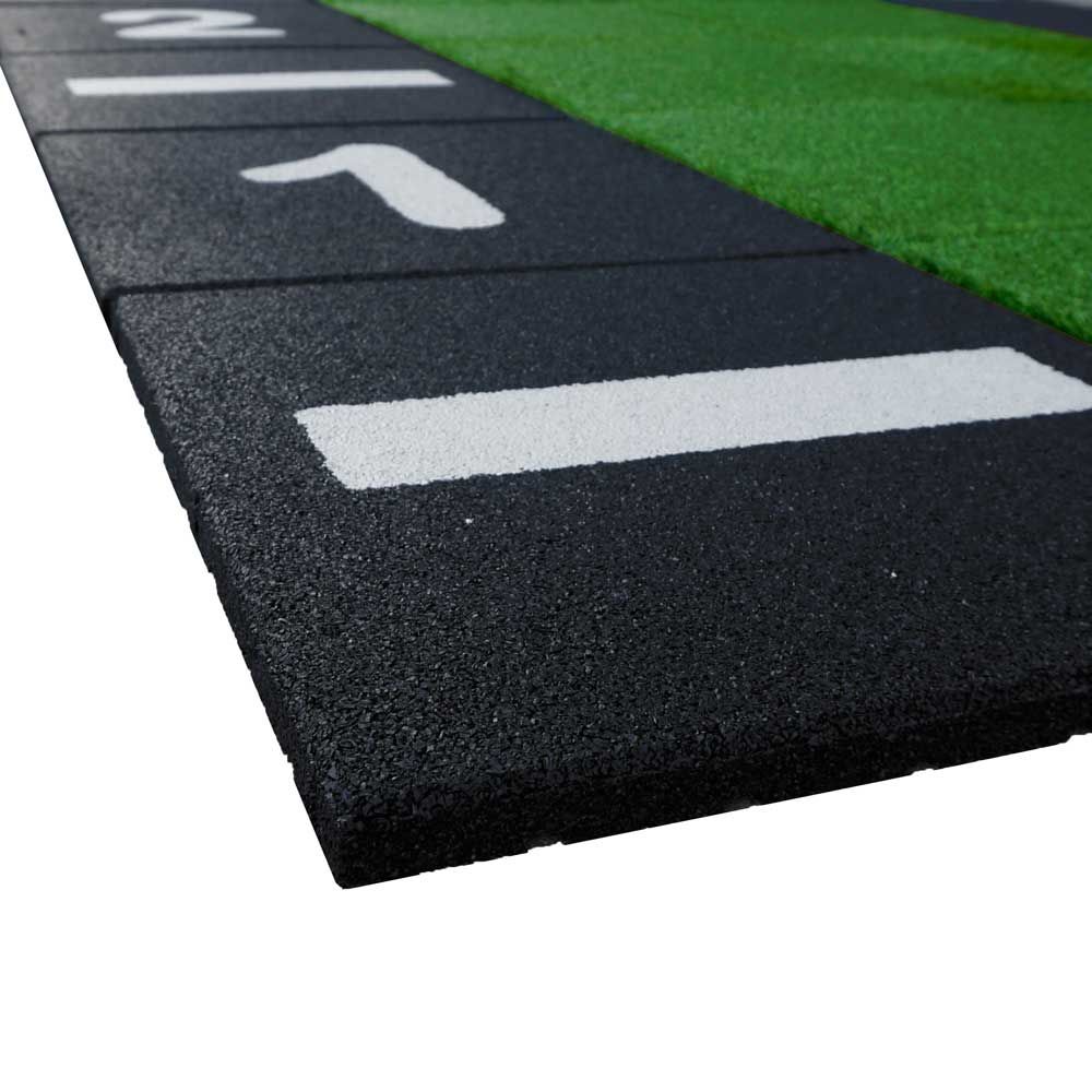 Constitué de 72 dalles de 50 x 50 cm dont 36 dalles en caoutchouc avec une couche supérieure de gazon artificiel, 18 dalles de caoutchouc noir avec bande, 8 dalles de caoutchouc noir avec les numéros de 1 à 8, 1 dalle de caoutchouc noir avec X et 9 dalles de caoutchouc noir uni.
