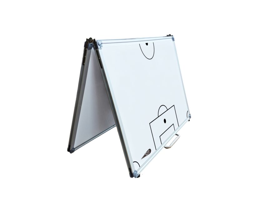 Tableau magnétique et effaçable foot de marque Powershot. Idéal Collectivités et Clubs. Idéal Enseignants et Coachs. Tableau de 120 x 90 cm pliable pour donner un tableau de 90 x 60 cm. Avec marquage terrain de foot. Livré avec un feutre, un tampon, 11 magnets bleus, 11 rouges, 2 jaunes et 1 noir. L’unité.
